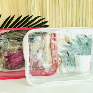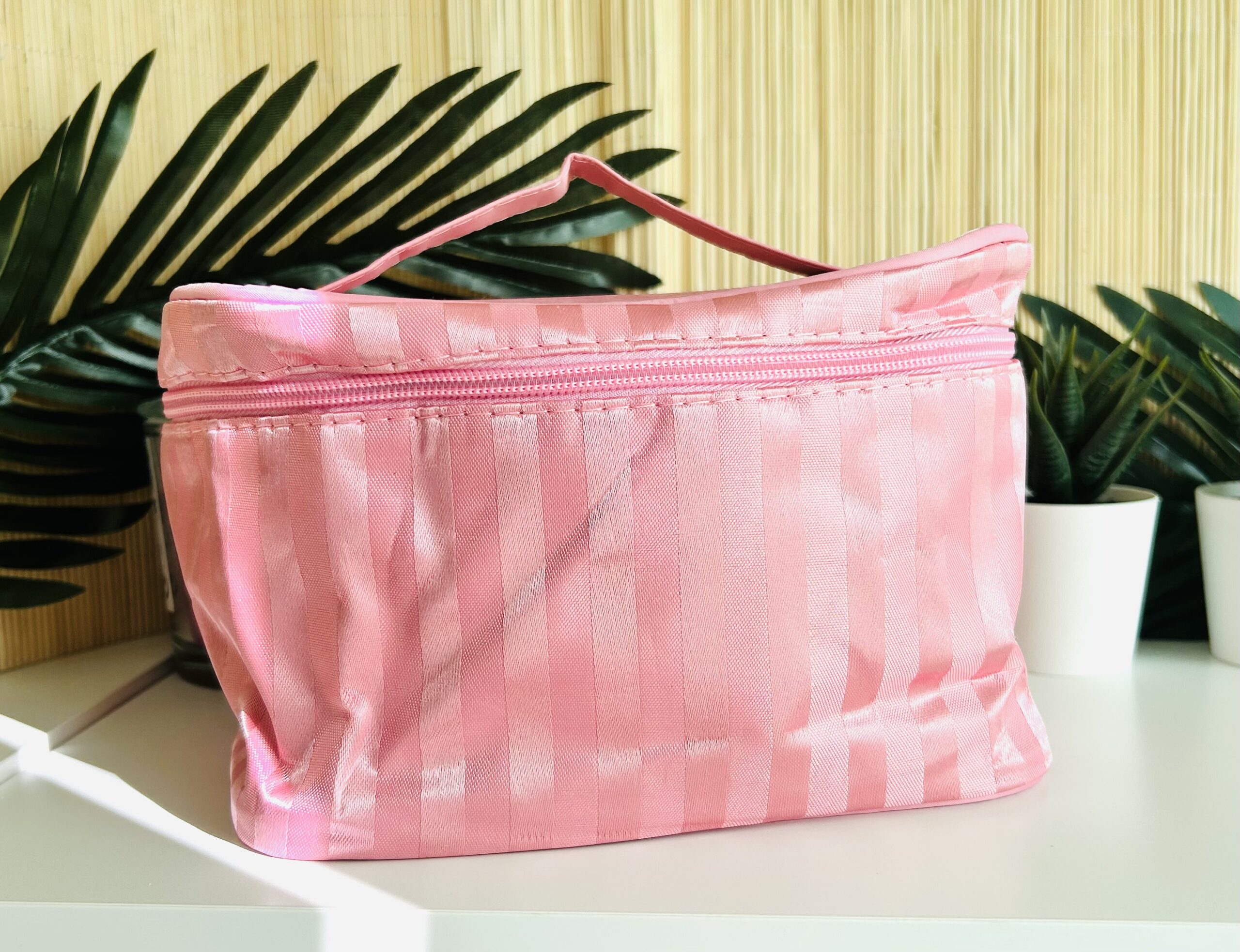 Neceser cuadrado rosa con rayitas y asa.